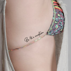Fais une déclaration avec le tatouage temporaire "Be the exception" de minink. Inspiré par l'âme rebelle et l'esprit intrépide, ce design est parfait pour ceux qui veulent se distinguer de la masse. Porte-le fièrement sur ton bras lors du prochain festival ou affiche-le sur ta cheville lors de ton prochain voyage d'aventure. Fabriqué avec la technologie innovante des fruits Jagua, ta déclaration dure jusqu'à deux semaines. Sois audacieux, sois unique, sois l'exception !