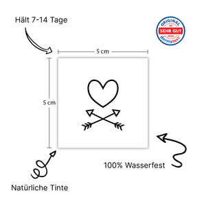 Élégant dans sa forme et son rayonnement - fait pour les vrais amateurs de tatouage. Porte ce design "cœur avec flèches croisées" comme un élégant accessoire temporaire.