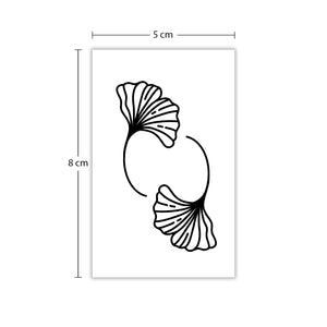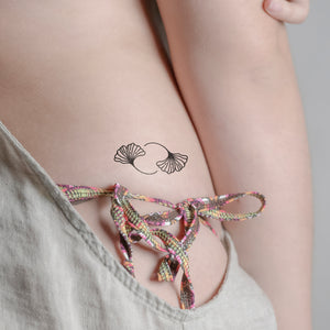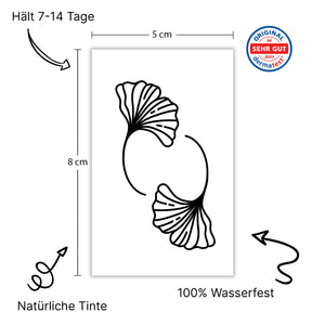 Deux feuilles de ginkgo stylisées se font face, reliées par une ligne sinueuse. Ce motif symbolise l'énergie vitale, le lien et le changement - un tatouage ginkgo minimaliste et temporaire de Nieladesign.