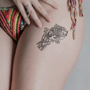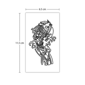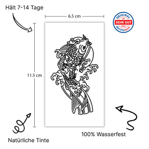 Ce motif riche en détails montre un poisson koi, intégré dans un ornement floral. Le tatouage koi représente la persévérance, le changement et la chance - un élégant tatouage minink avec une profondeur symbolique qui t'accompagnera pendant environ deux semaines.