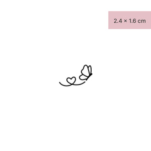 Fais battre ton cœur avec notre papillon avec un cœur - Design. Ce charmant tatouage temporaire symbolise la liberté et l'amour. Grâce à la technologie de tatouage innovante basée sur le fruit de la jagua, le dessin dure jusqu'à deux semaines et pénètre dans la première couche de la peau. Décore ton corps avec ce tatouage d'une beauté minimaliste sur les bras, les jambes ou où tu veux et montre ainsi à tous ton amour pour la nature.