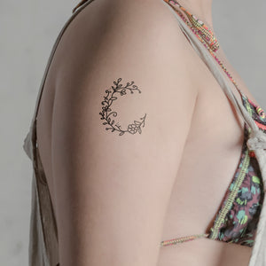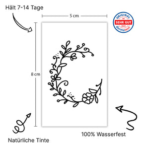 Questo motivo descrive una delicata "C" di rami, fiori e foglie. Abbraccia la pelle in un arco naturale - perfetto come mini-tatuaggio sulla clavicola o sulla scapola per una poesia botanica temporanea.