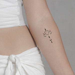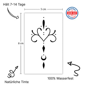 Questo giocoso tatuaggio ornamentale a forma di cuore sembra un elemento di gioielleria storica - elegante, delicato ed espressivo. Questo tatuaggio minink vi accompagnerà fino a due settimane con la sua leggerezza decorativa.