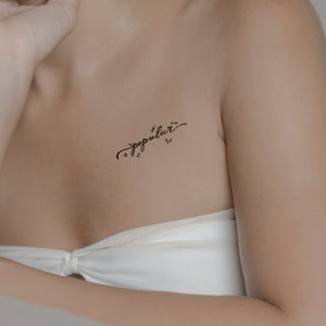 Scritte disegnate a mano con abbellimenti giocosi. Questo tatuaggio celebra l'amore per se stessi in modo delicato e sottile, come un promemoria sulla pelle.
