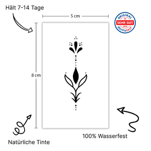 Le linee dinamiche di questo tatuaggio ricordano un fiore di loto stilizzato in piena fioritura. Un altro bellissimo disegno di minink, indossabile per circa 14 giorni sulla vostra parte del corpo preferita.
