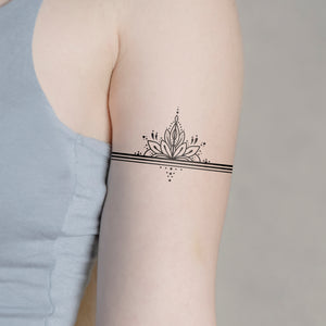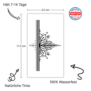 Questo tatuaggio con il loto si dispiega come un bel tatuaggio per il polso, ideale per chi ama lo stile individuale. La combinazione di forme e linee floreali dona equilibrio al vostro look.