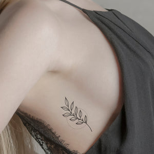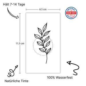 Questo tatuaggio mostra un elegante ramo con foglie sottili, intervallato da un sottile cerchio punteggiato. La composizione simboleggia la crescita, la tranquillità e la naturalezza - sottile ma espressiva. Un mini-tatuaggio per l'avambraccio, la spalla o il collo.