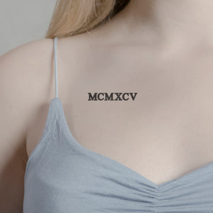 Celebrate il vostro anno di nascita con stile: il nostro tatuaggio temporaneo "numero romano MCMXCV (1995)" è il modo perfetto per combinare personalità e storia. Realizzato con la nostra speciale tecnologia Jagua fruit, offre un aspetto da vero tatuaggio che dura fino a due settimane sulla pelle ed è quindi perfetto per l'avambraccio o la caviglia, ad esempio, per aggiungere un tocco personale al vostro look.