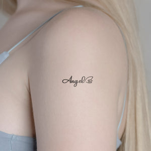 Unser "Angel" Schriftzug ist ein himmlischer Touch für deine Haut. Dieses lieblich gestaltete, temporäre Tattoo hält dank der Jagua-Frucht-Technologie bis zu zwei Wochen auf deiner gewünschten Körperstelle und verleiht dir eine himmlische Aura. Getragen z. B. auf deiner Schulter oder am Knöchel ist es ideal für Festivalbesucherinnen oder Träumerinnen, die ihren Körperschmuck gerne variieren. Probiere es aus, ohne Schmerzen und langfristige Bindung.