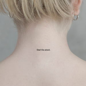 Unser "Don't be afraid"-Tattoo ist eine Erinnerung an Mut und die Überwindung von Ängsten. Trage dieses temporäre Tattoo als Symbol deiner Stärke, das dich daran erinnert, dass du alles schaffen kannst. Perfekt für diejenigen, die für einen besonderen Anlass eine sichtbare und kraftvolle Affirmation wünschen. Dank der innovativen Jagua-Frucht-Technologie hält das Tattoo bis zu zwei Wochen und lässt sich auch unkompliziert auftragen. Zeige der Welt, dass du keine Angst hast, du selbst zu sein!