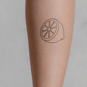 Erfrischend anders - das ist unser temporäres Tattoo "Halbe Zitrone" von minink. Mit der innovativen Jagua-Frucht-Technologie hält dieses Tattoo bis zu zwei Wochen und bringt einen Hauch von Sommer auf deine Haut. Perfekt für alle lebenslustigen Frauen, die das Leben in vollen Zügen geniessen. Trage es auf Festivals, auf deinen Mädelstrips oder im Alltag - mit diesem Fake-Tattoo zeigst du deine Liebe zum Körperschmuck und setzt ein fruchtiges Statement!