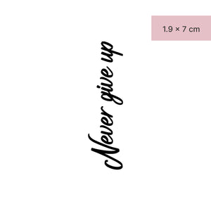 Spüre die Kraft der Worte mit dem temporären "Never give up" - Tattoo von minink. Inspiriert von der unbeugsamen weiblichen Stärke, ist dieses Design perfekt für jede mutige Frau, die keine Angst hat, ihre Träume zu verfolgen. Trage es auf deinem Handgelenk, um dich täglich an deine innere Stärke zu erinnern oder zeige es stolz auf deinem Oberarm beim nächsten Festival. Hergestellt mit innovativer Jagua-Frucht-Technologie, hält dein Statement bis zu zwei Wochen.