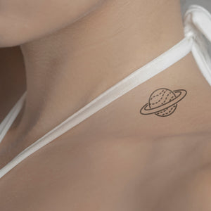 Unser himmlisches Tattoo-Design "Planet Saturn" ist die perfekte Tattooalternative für alle Universum-Enthusiasten und Weltraumbegeisterte. Mit der Jagua-Frucht-Technologie bietet dir dieses temporäre Tattoo bis zu zwei Wochen Halt. Trage es auf dem Unterarm oder jeder anderen Wunschstelle auf, um einfach überall deine Faszination für das Kosmische auszudrücken.