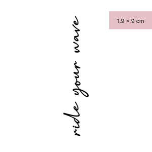 Das "Ride your wave"-Tattoo ist eine Ode an die Freiheit und das Abenteuer. Ideal für Surferinnen oder diejenigen, die das Meeresrauschen lieben. Mit seiner Sichtbarkeit von bis zu zwei Wochen dank der Jagua-Frucht-Technologie, macht es sich hervorragend auf deiner Wade, dem Oberarm oder an welcher Stelle du es auch immer gerne gekonnt in Szene setzen möchtest.
