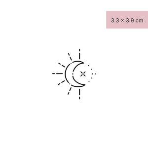 Mit unserem temporären Tattoo - Design "Sonne & Mond künstlerisch" setzt du ein aufsehenerregendes Statement! Dieses Tattoo vereint Tag und Nacht in einem harmonischen Design. Ideal für all jene, die Gegensätze lieben. Aufgetragen z. B. auf Schulter oder Fussrücken, hält das Motiv bis zu zwei Wochen und fügt sich nahtlos in deine erste Hautschicht ein. Der perfekte Begleiter für alle, die es lieben, mit ihrem Stil zu experimentieren und sich auszudrücken.