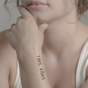 Lebe deinen Abenteuergeist mit unserem "Take Risks" temporären Tattoo aus. Dieses Design ist perfekt für die mutige und unerschrockene Frau, die keine Angst hat, Risiken einzugehen. Die kraftvolle Botschaft wird durch eine moderne und stilvolle Schriftart hervorgehoben. Trage es auf deinem Unterarm, um dich selbst an deine Stärke zu erinnern oder auf deinem Knöchel, um ein subtiles Statement zu setzen. Dank der innovativen Jagua-Frucht-Technologie verschmilzt es sanft mit deiner Haut und lässt sich dafür total leicht auftragen. Trage es, wo auch immer du deine Geschichte erzählen möchtest.